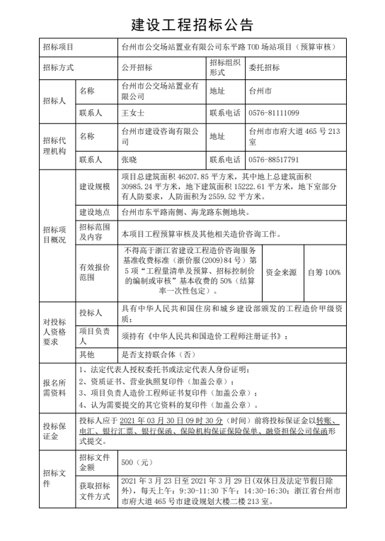 臺州市公交場站置業有限公司東平路TOD 場站項目(預算審核)招標公告