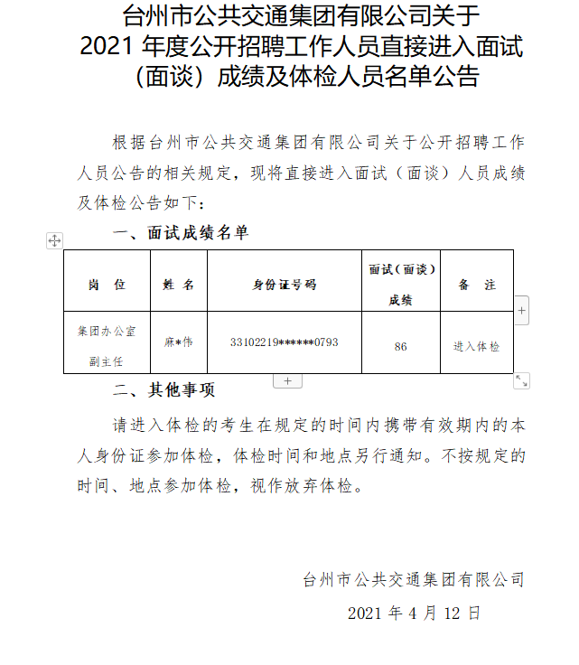 臺州市公共交通集團有限公司關于 2021年度公開招聘工作人員直接進入面試(面談)成績及體檢人員名單公告