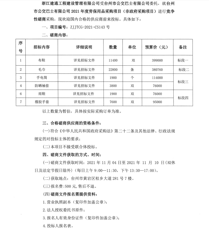 臺州市公交巴士有限公司2021年度勞保用品采購項目的(非政府采購)競爭性磋商采購公告