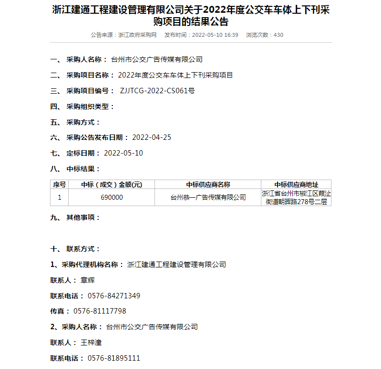 浙江建通工程建設管理有限公司關于2022年度公交車車體上下刊采購項目的結果公告