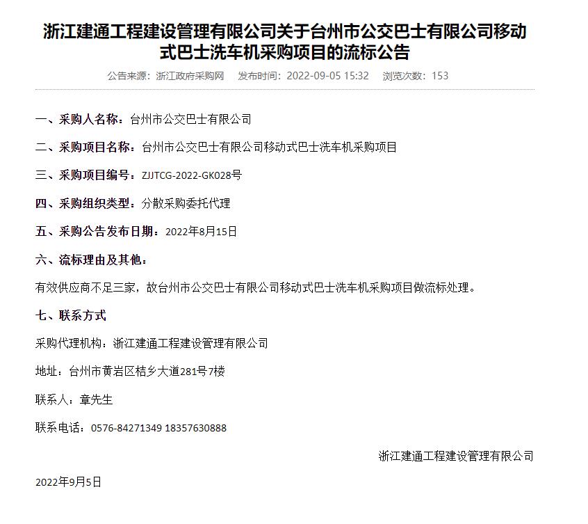 浙江建通工程建設管理有限公司關于臺州市公交巴士有限公司移動式巴士洗車機采購項目的流標公告