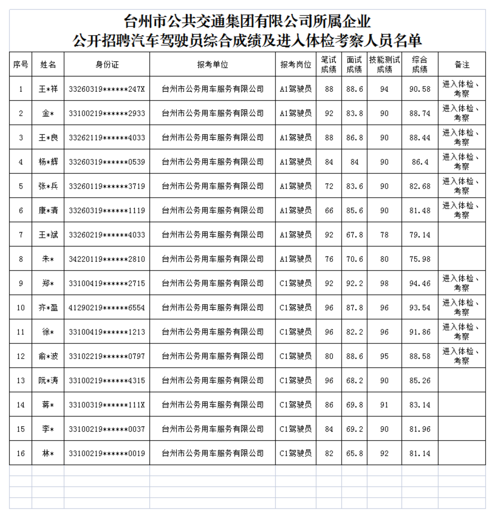 根據(jù)臺(tái)州市公共交通集團(tuán)有限公司所屬企業(yè)臺(tái)州市公務(wù)用車(chē)服務(wù)有限公司公開(kāi)招聘汽車(chē)駕駛員公告相關(guān)要求,現(xiàn)將報(bào)考人員綜合成績(jī)及進(jìn)入體檢、考察人員名單公告如下: