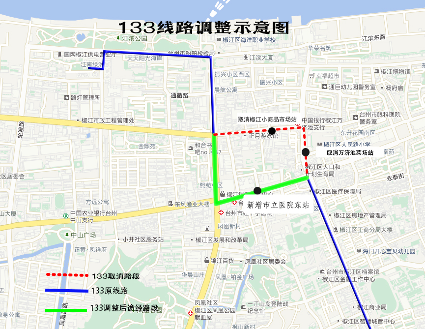 受屋基里區塊改造及施工影響,自9月18日起133路解放北路(七號碼頭站)與江城南路(椒江區辦證中心站)間,雙向調整為經中山東路運行。臨時取消椒江小商品市場、萬濟池菜場站點,新增市立醫院東站點。