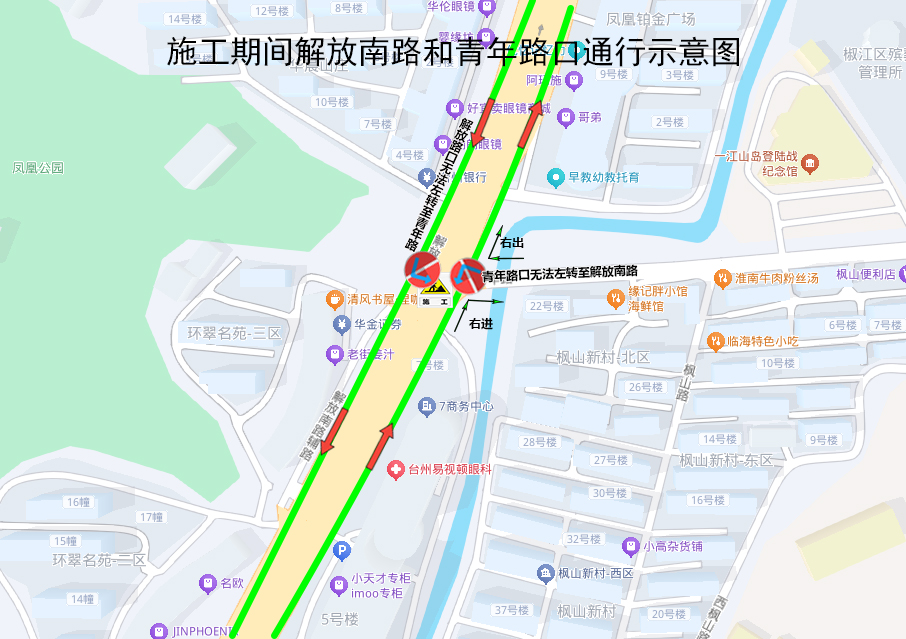 三山往東山公園方向:調(diào)整由解放北路經(jīng)中山東路、建設(shè)路接原線路,臨時取消十字馬路(路西側(cè))、烈士陵園(路南側(cè))站點,增設(shè)椒江街心公園(路南側(cè))、椒江區(qū)辦證中心(路西側(cè))站點。