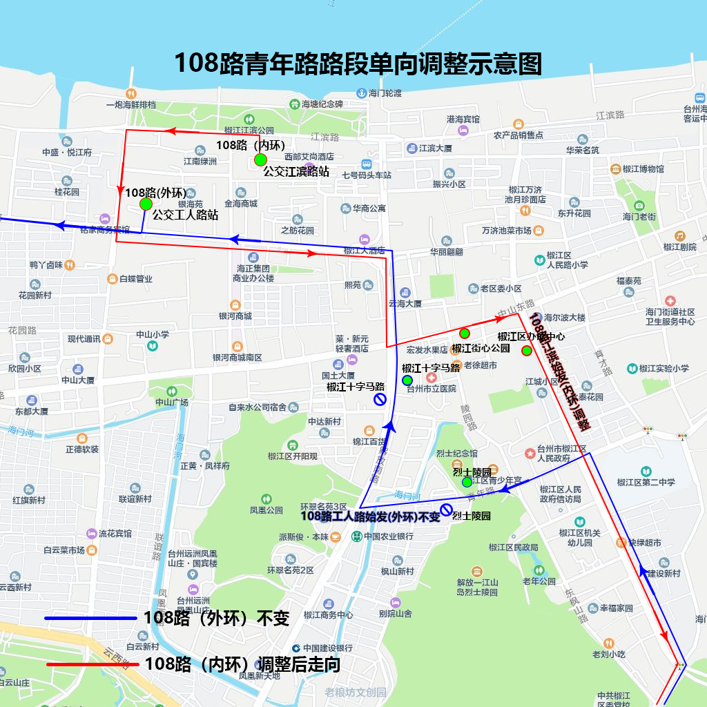 江濱路始發(fā)(內(nèi)環(huán)):調(diào)整由解放北路經(jīng)中山東路至建設(shè)路接原線路,臨時取消十字馬路(路西側(cè))、烈士陵園(路南側(cè))站點,增設(shè)椒江街心公園(路南側(cè))、椒江區(qū)辦證中心(路西側(cè))站點。