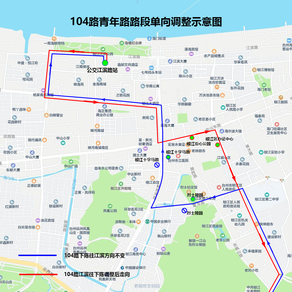 江濱站往下陳方向:調(diào)整由解放北路經(jīng)中山東路至建設(shè)路接原線路(不經(jīng)過青年路)。臨時取消十字馬路(路西側(cè))、烈士陵園(路南側(cè))站點,增設(shè)椒江街心公園(路南側(cè))、椒江區(qū)辦證中心(路西側(cè))站點。