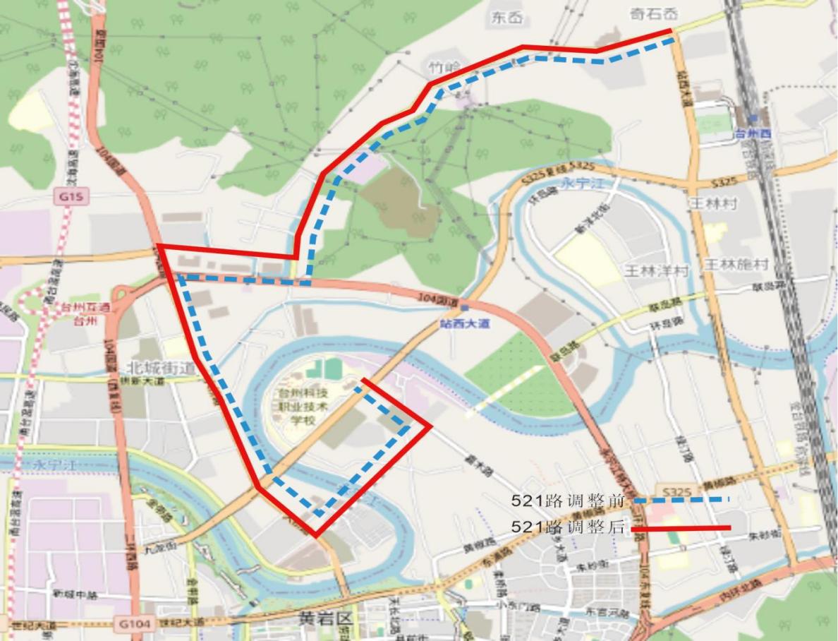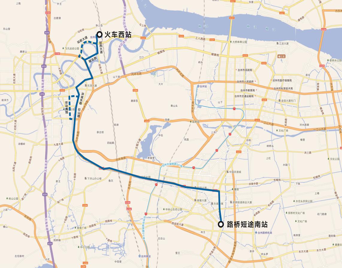 路橋短途南站-泰隆街-路橋大道(東)-路橋大道(西)-大環(huán)線-印山路-環(huán)城東路-東浦路-黃椒路-二環(huán)東路-聯(lián)島路-站西大道-火車西站。(不再經(jīng)過勞動(dòng)南路、站前大道)