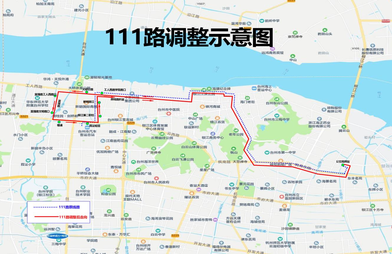 1.觀江苑及周邊小區(qū)乘客可在大橋公園站乘坐調(diào)整后的111路到葭沚樞紐,往市民廣場、市中心醫(yī)院方向可換乘136、510等線路;往椒江老城區(qū)及市立醫(yī)院新院方向可換乘101、138等線路。