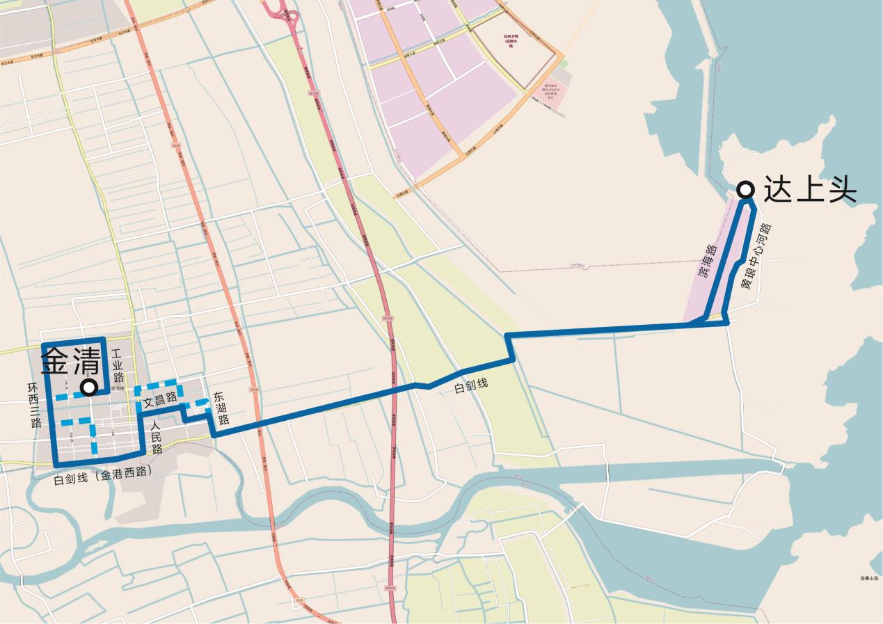 環(huán)西一路-金清大道-工業(yè)路-中心大道-環(huán)西三路-金港西路(白劍線)-人民路-文昌西路-文昌東路-糧庫路-花園新村內(nèi)部路-東湖路-白劍線-海濱路-黃瑯中心河路。