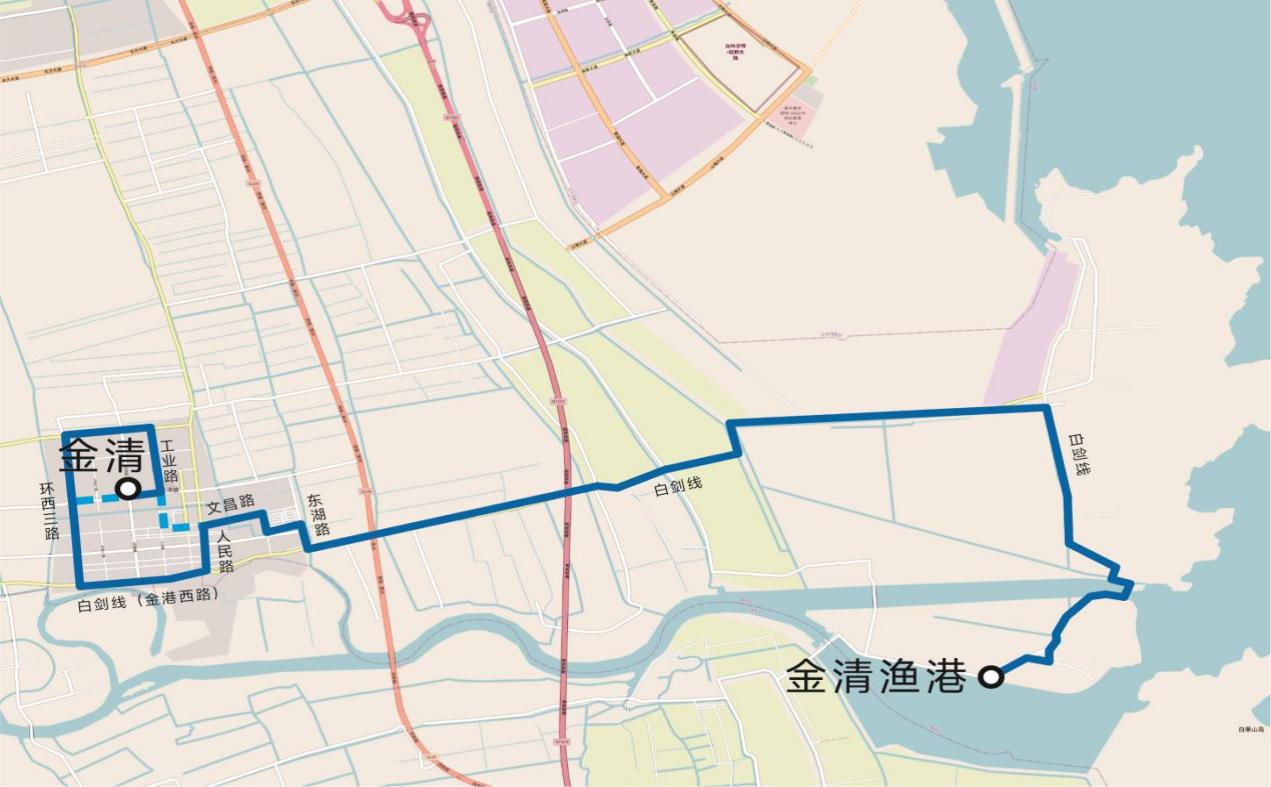 環(huán)西一路-金清大道-工業(yè)路-中心大道-環(huán)西三路-金港西路(白劍線)-人民路-文昌西路-文昌東路-糧庫路-花園新村內(nèi)部路-東湖路-白劍線-白沙外堤。