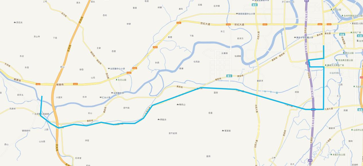 公交茅畬站、茅畬、茅畬中學(xué)(黃巖縣委舊址)、浦洋(老媽媽陳列館)、白浦岙、水對村、大禮村、罕溪頭、小里橋東(新增)、百畝洋、澄江三官堂、橫屋(新增)、臨古、后林、橋前、沈岙里、山頭舟、柑橘博覽園、鳳洋、焦坑醫(yī)院、焦坑、大巍頭、松興堂、橋頭王、澄東、仙浦汪、大樹下、黃巖中學(xué)、羅家匯、新堂花園、公交客運(yùn)西站。