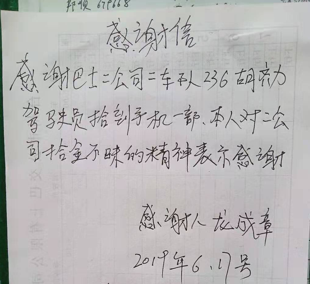 無(wú)獨(dú)有偶,當(dāng)天下午17點(diǎn)左右,駕駛員胡齊力師傅結(jié)束一天的運(yùn)營(yíng)回到場(chǎng)站進(jìn)行例檢,也發(fā)現(xiàn)了一位乘客丟失的手機(jī)。失主龍先生于下午18點(diǎn)左右到院橋車(chē)場(chǎng)領(lǐng)回遺失的手機(jī)時(shí),駕駛員胡師傅已經(jīng)下班。于是,龍先生特地寫(xiě)了一封感謝信留給駕駛員,對(duì)公司駕駛員良好的精神風(fēng)貌和職業(yè)素養(yǎng)進(jìn)行表?yè)P(yáng)。