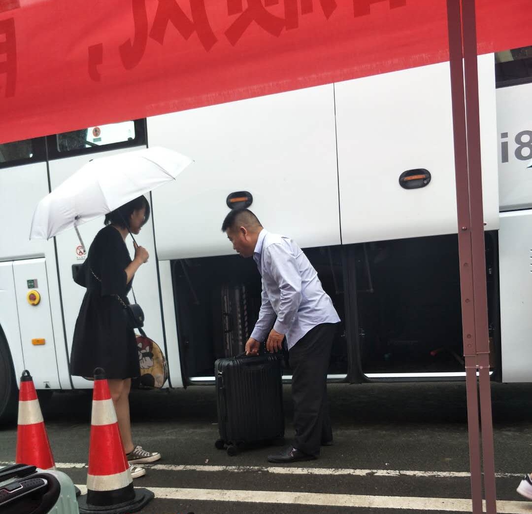 在臺(tái)州學(xué)院的圖書(shū)館前,定制公交的車輛整齊地停放在學(xué)校特制的遮雨棚前。學(xué)生們打著傘,拖著行李向車輛走來(lái),駕駛員師傅熱情熟練地幫他們將行李放好,學(xué)生們一邊向師傅說(shuō)著“謝謝”。