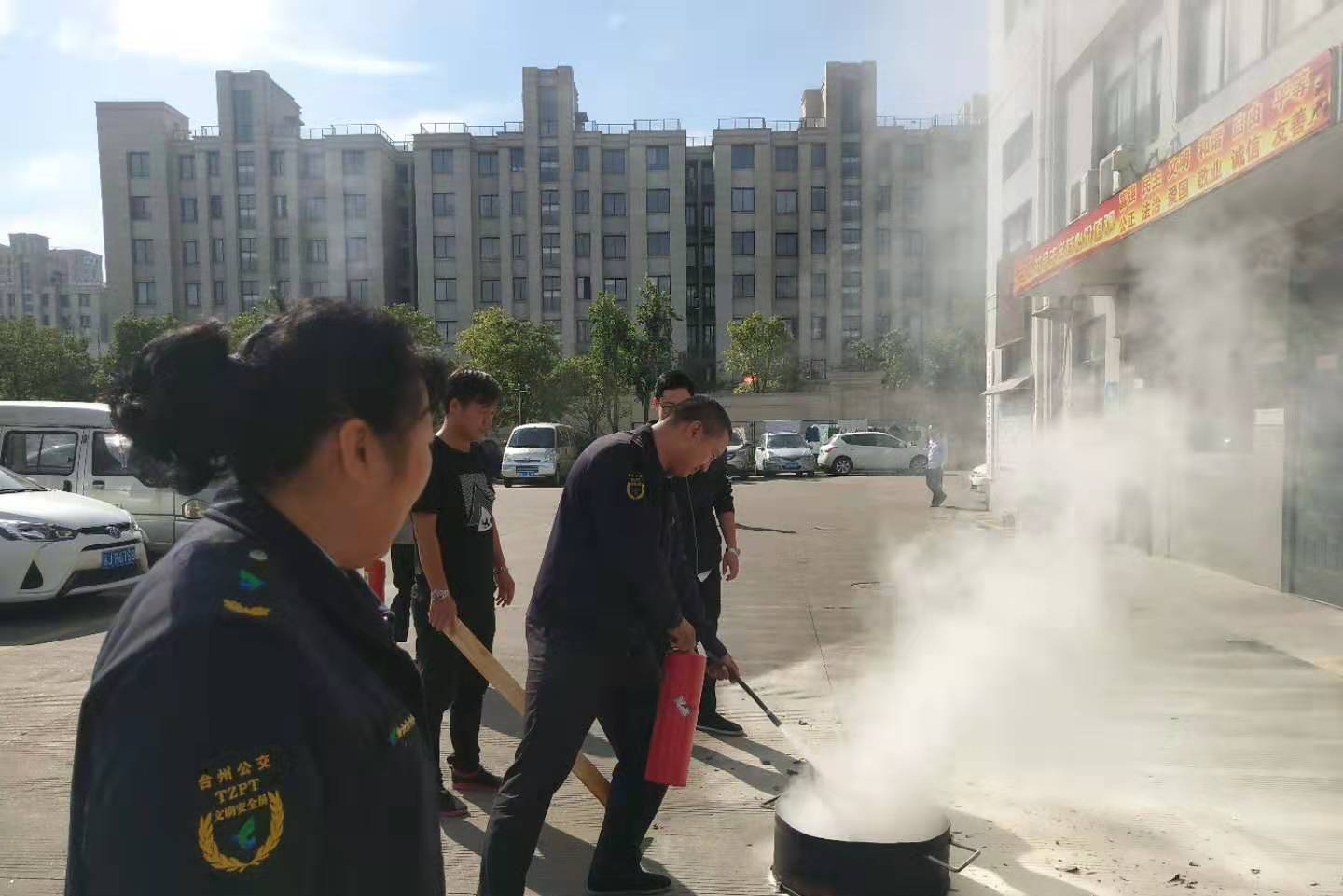 在一車隊客運總站演練現場,保安人員在場站內地面發現一處火源燃物。車隊管理人員第一時間組織人員疏散,將人員疏散至安全空曠的上風口位置后,再迅速組織駕駛員使用干粉滅火器對火源處進行滅火撲救。滅火成功后,清點疏散人員人數及應急人員人數。