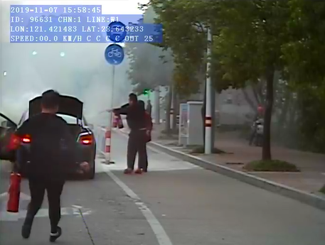 11月7日下午15點57分,W1路劉瑞嘉師傅駕駛公交車到臺州體育場路與東環大道交叉路口附近,突然注意到前方一輛黑色私家車的車頭部位濃煙滾滾,情況十分危機。一名疑似車主的男子正在向過往車輛求救,但都沒有車輛停下。